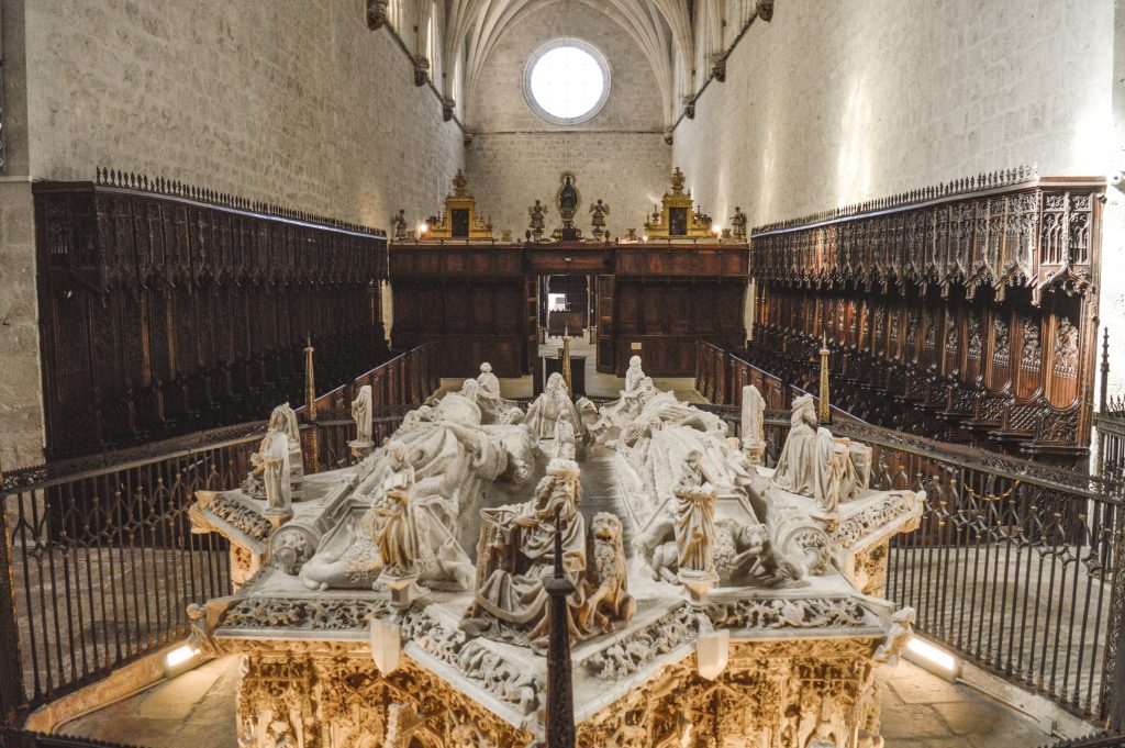 Al cruzar el portón de acceso a la Cartuja de Miraflores, nos encontramos con el claustro medieval y acto seguido con una estatua de piedra de San Bruno —fundador de la orden— en el patio. Una vez en el interior, el coro de los padres —cuarenta sitiales distribuidos en dos grupos— atrapará la atención del visitante. El centro de la nave está reservado para los sepulcros Reales, un encargo de Isabel la Católica al artista Gil de Siloé. Aquí, encontraremos